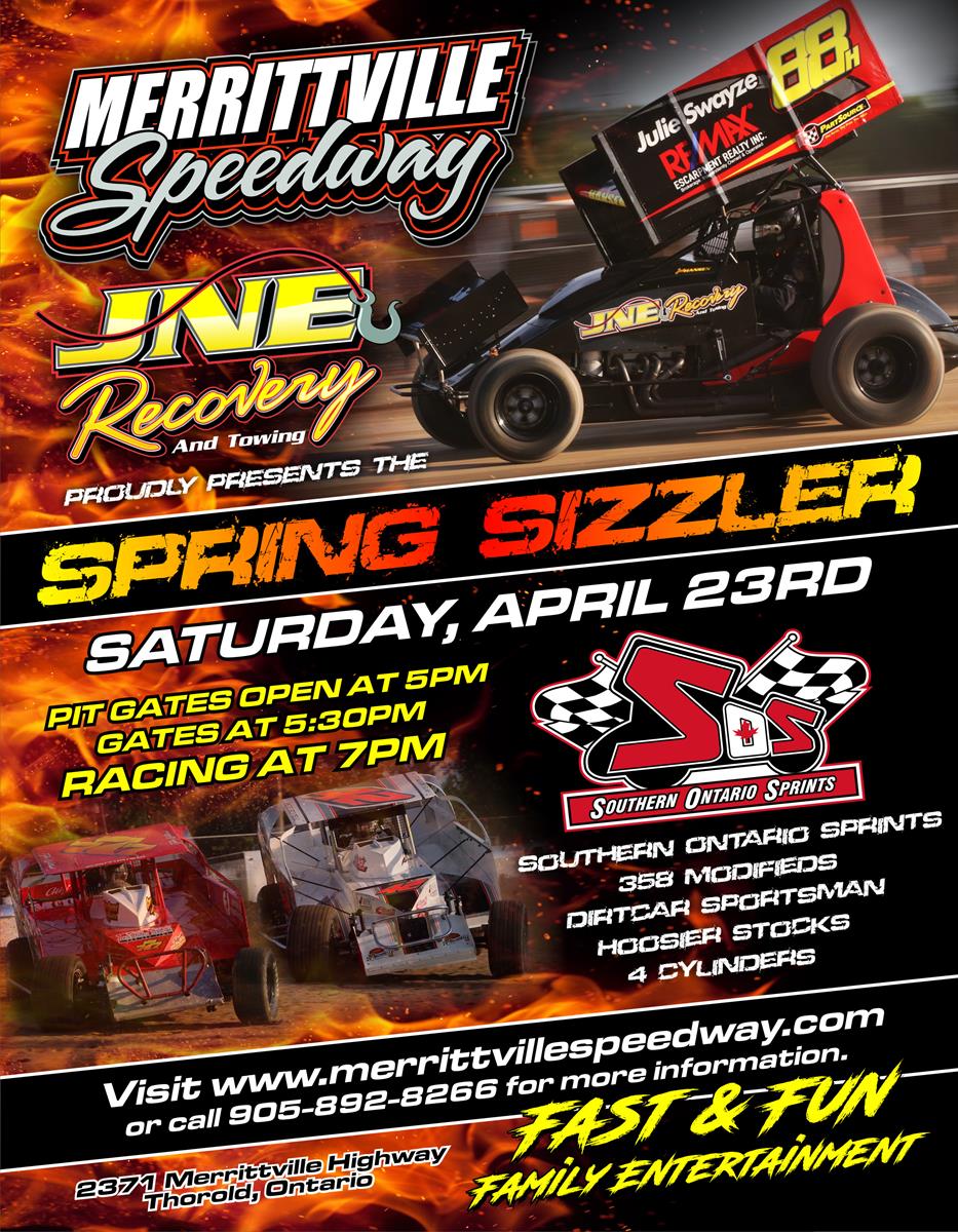 The racing season gets under way with the JNE Recovery Spring Sizzler on Saturday April 23rd. The 2022 edition of the event will feature the Southern Ontario Sprints returning to Merrittville. The Corr/Pak Merchandising 358 Modifieds, The Right Choice Auto & Leisure DIRTcar Sportsman, Hoosier Stocks and The Vansickle Pet Value/PV on the Lane 4 Cylinders round out the night of action.
