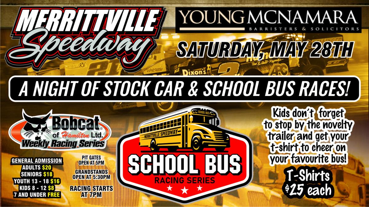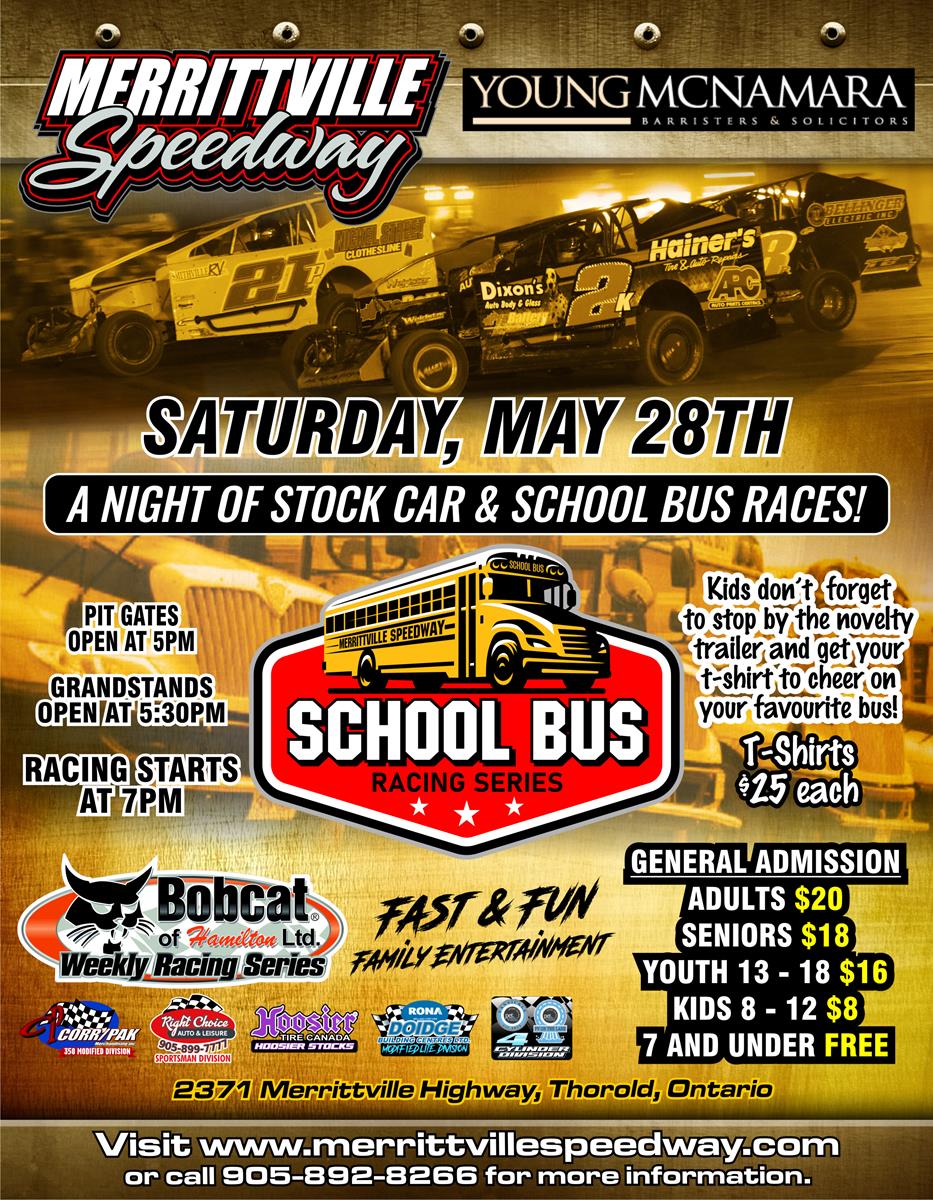 THOROLD, ONTARIO (May 25, 2022) … After racing on Victoria Day Monday, Merrittville Speedway is right back in action on Saturday, May 28 as Young McNamara Barristers & Solicitors presents a full card of racing plus the first school bus race of the year. The Right Choice Auto & Leisure DIRTcar Sportsman will be featured as it is round one of the Canadian Western Region for the Sportsman Super DIRTcar Series.