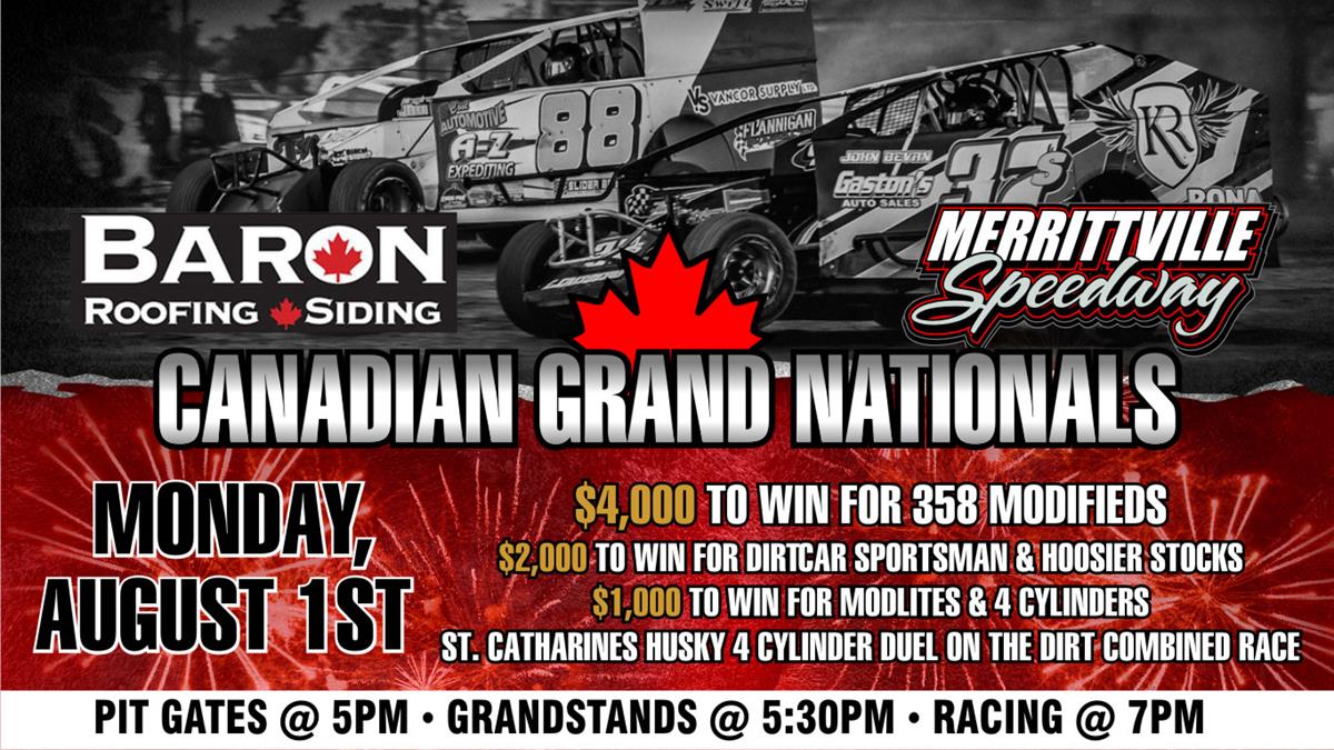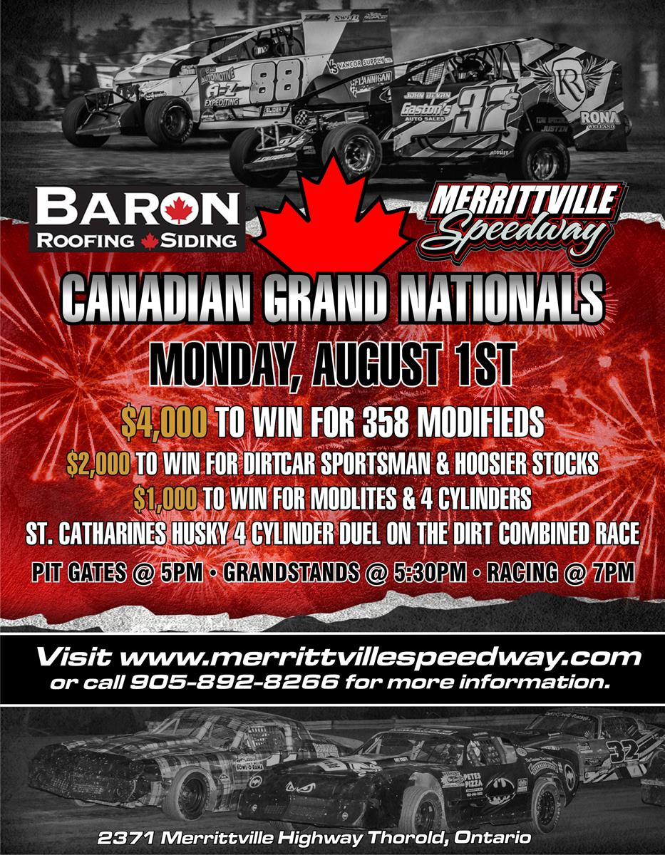 THOROLD, ONTARIO (July 13th, 2022) … Something special is coming to Merrittville Speedway. Mark your calendars for Monday August 1st, 2022, when Merrittville Speedway presents for the first time ever, the Canadian GRAND Nationals