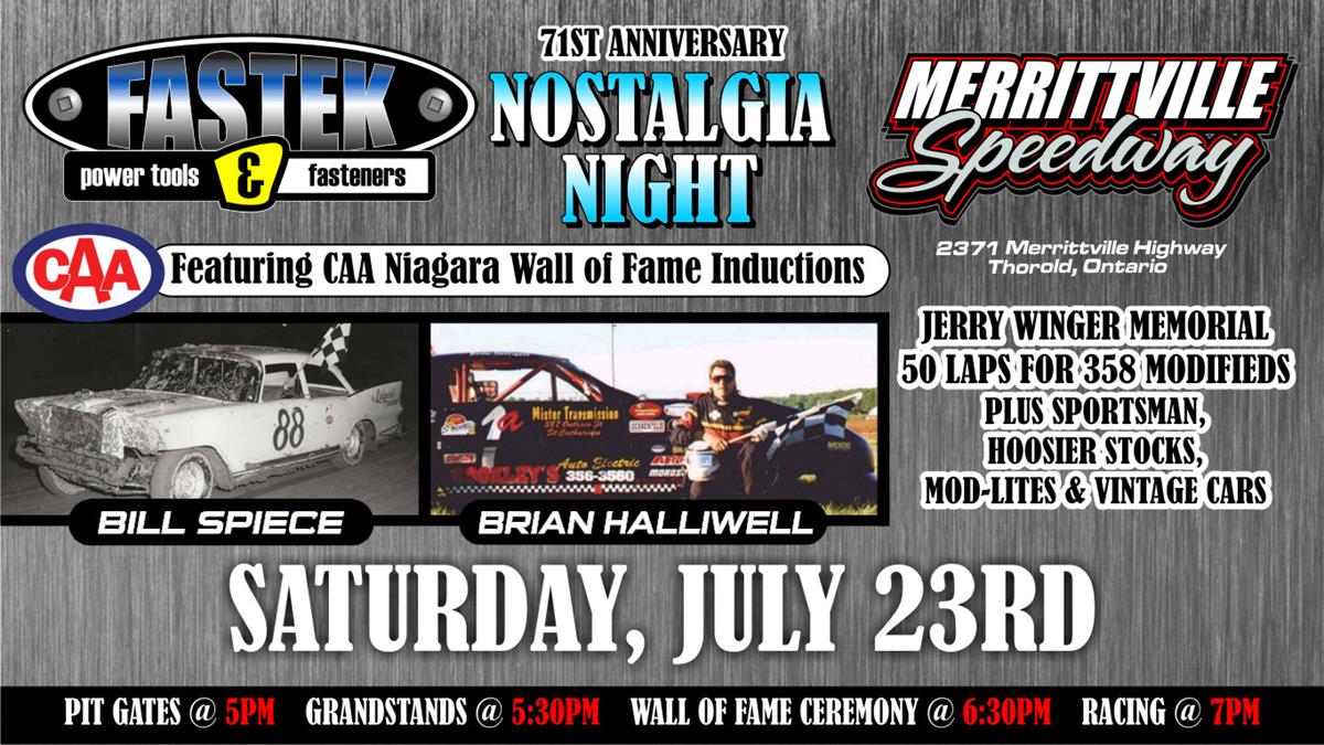 THOROLD, ONTARIO (July 18, 2022) … Merrittville Speedway will be inducting two new members into the CAA Wall of Fame as well as race the Jerry Winger Memorial for the Corr/Pak Merchandising 358 Modifieds this coming Saturday night at Merrittville Speedway.