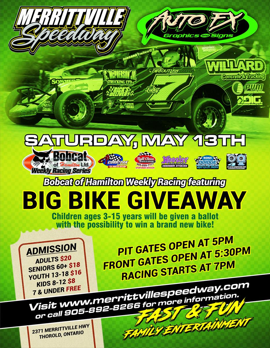 THOROLD, ONTARIO (May 8, 2023) … Merrittville Speedway is preparing for one of its most popular nights of the year this weekend. Auto FX Graphics and Signs night on May 13th will also mark the BIG BIKE GIVEAWAY in addition to racing from the five Bobcat of Hamilton Weekly Racing Series divisions.