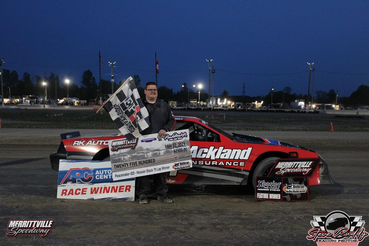 THOROLD, ONTARIO (May 22nd, 2023) … Merrittville Speedway hosted what was to be the second half of its Victoria Day Long Weekend Double Header Monday. While Mother Nature washed out Saturday’s action, Monday more than made up for it with competitive hard racing headlined by the 75 lap Hoosier Stock feature presented by 420 Peacemaker. Ryan Beagle from Victoria, Ontario scored the win and collected the $2500. St. Catharines, Ontario’s Mat Williamson won the 40 lap Corr/Pak Merchandising 358 Modified feature. Brent Begolo of Thorold, Ontario won his second Rona Doidge Modified Lite feature of the season and Brian McDonald of Cornwall, Ontario won the Vanderlaan Building Products Northeast Late Model Alliance feature who visited Merrittville Speedway on Monday.