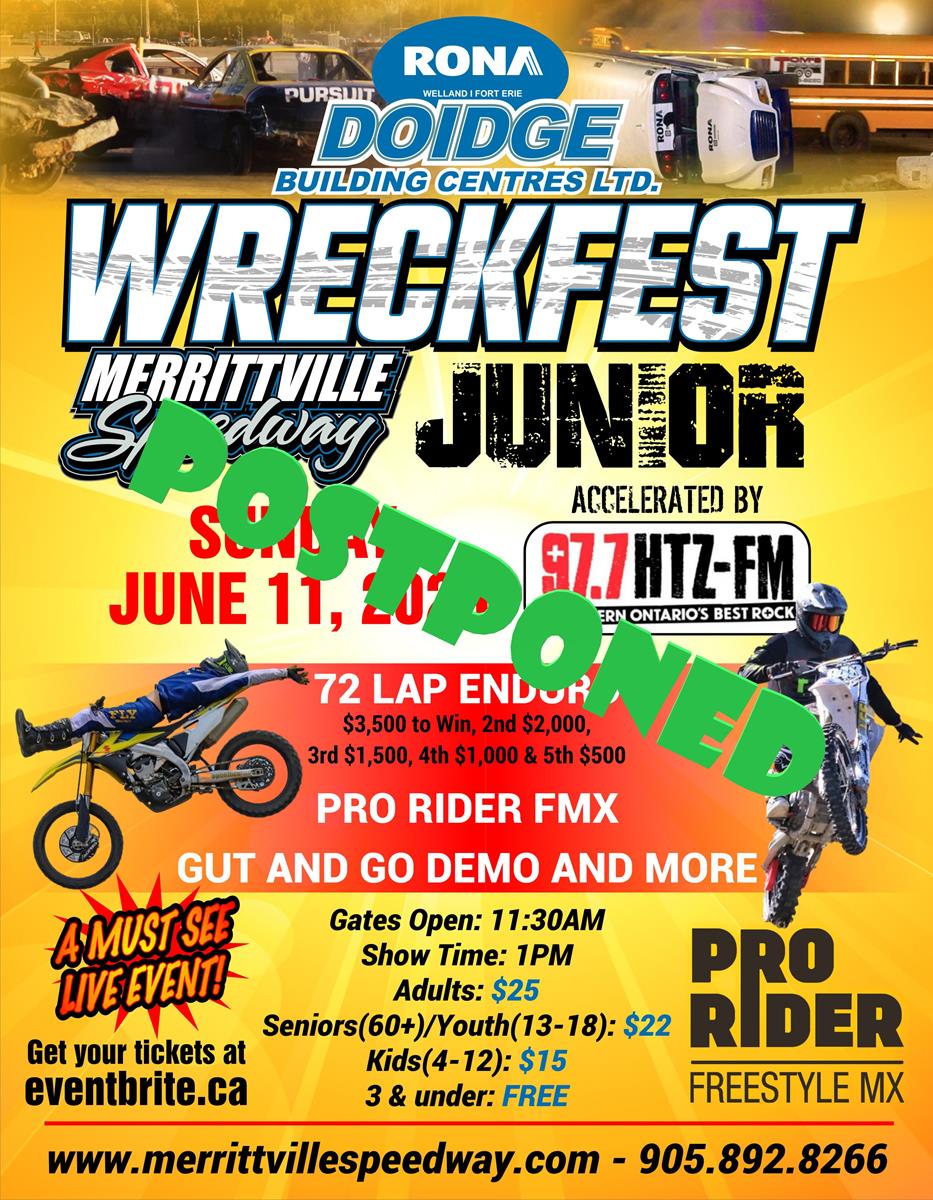 THOROLD, ONTARIO (June 11, 2023)...Due to the unfavorable weather forecast in the Niagara area, Wreckfest Jr will be postponed until July 2nd, 2023