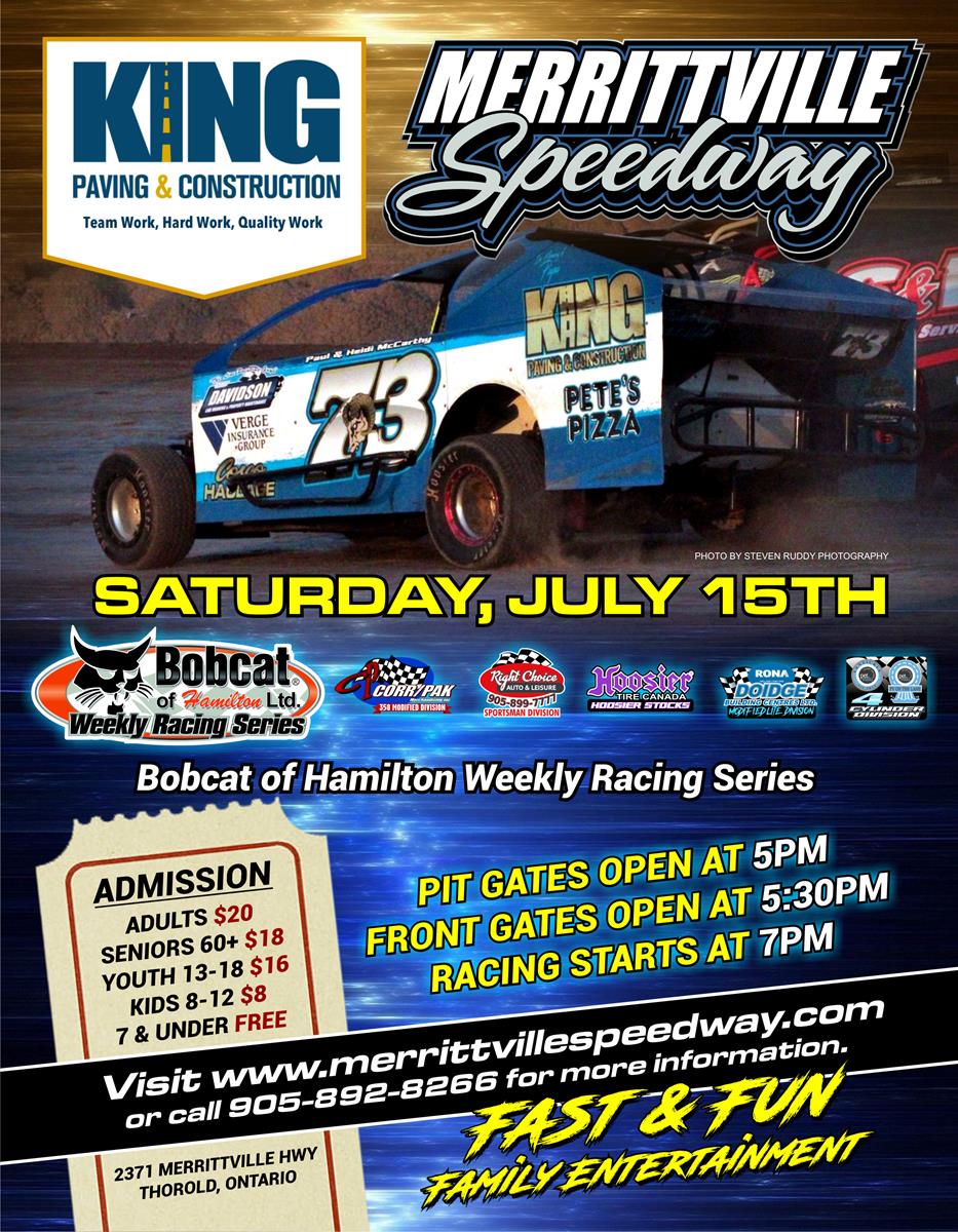 THOROLD, ONTARIO (July 10, 2023) … KING Paving & Construction Ltd will be presenting the racing action this coming Saturday night at Merrittville Speedway. In competition, fans will see a full Bobcat of Hamilton Weekly Racing program of the Corr/Pak Merchandising 358 Modifieds, Right Choice Auto & Leisure DIRTcar Sportsman, Hoosier Stocks, RONA/Doidge Building Centre Mod Lites, and the Vansickle Pet Valu/PV on the Lane 4 Cylinders.