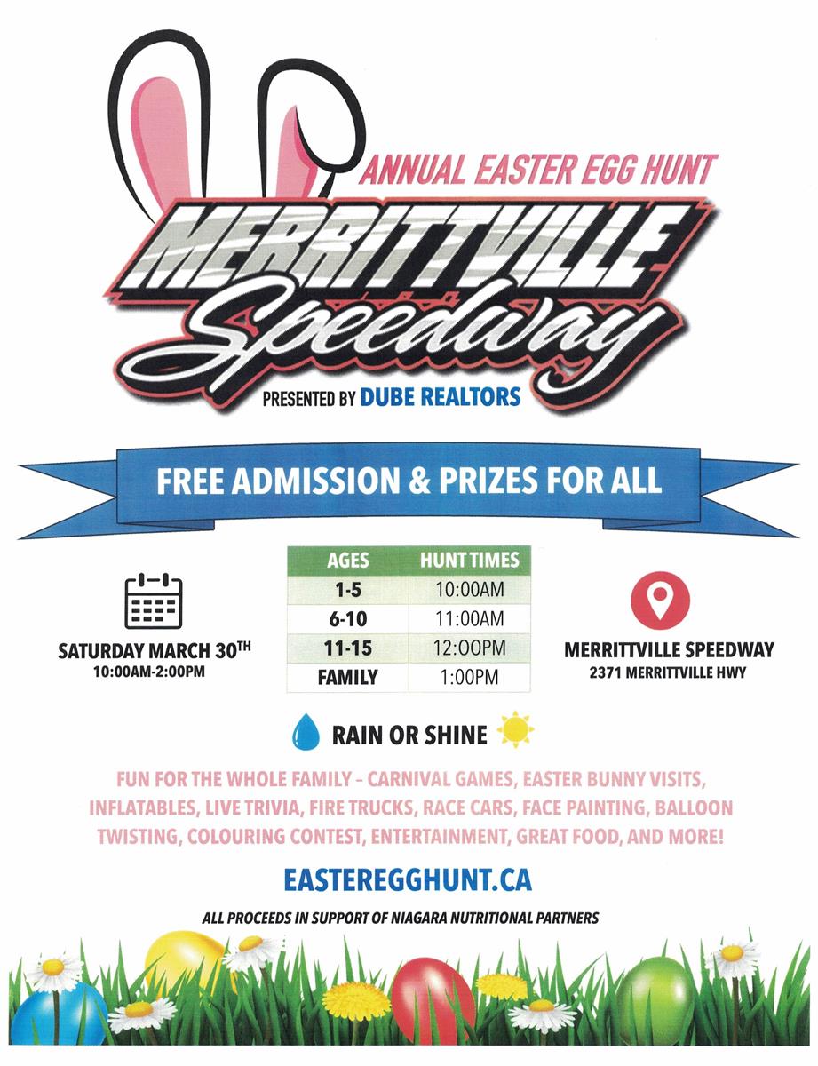 This year’s Easter Egg Hunt event will take place Saturday March 30th 10am 2pm at Merrittville Speedway. This is a FREE ADMISSION event for kids and families in the Niagara Region and beyond.