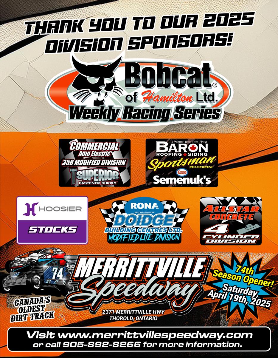 THOROLD, ONTARIO (February 1, 2025) … The 74th season of racing at Merrittville Speedway is right around the corner. The schedule is jammed-packed with events for every race fan, and a filled schedule of events for the Bobcat of Hamilton Weekly Racing Series, featuring the Commercial Auto Electric 358 Modifieds, Semenuk's Esso/Baron Roofing DIRTcar Sportsman, Hoosier Stocks, Rona Doidge Mod Lites, and Allstar Concrete 4 Cylinders.
