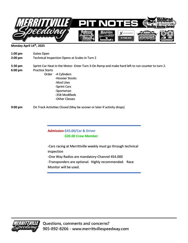 THOROLD, ONTARIO (April 9, 2025)...With local weather forecasts showing rain and much cooler April temperatures Thursday through Saturday, Merrittville Speedway owners and officials have decided to postpone the originally scheduled Test and Tune to a new date of Monday April 14th, 2025. Warmer temperatures and forecasted sun will make for a much better date.