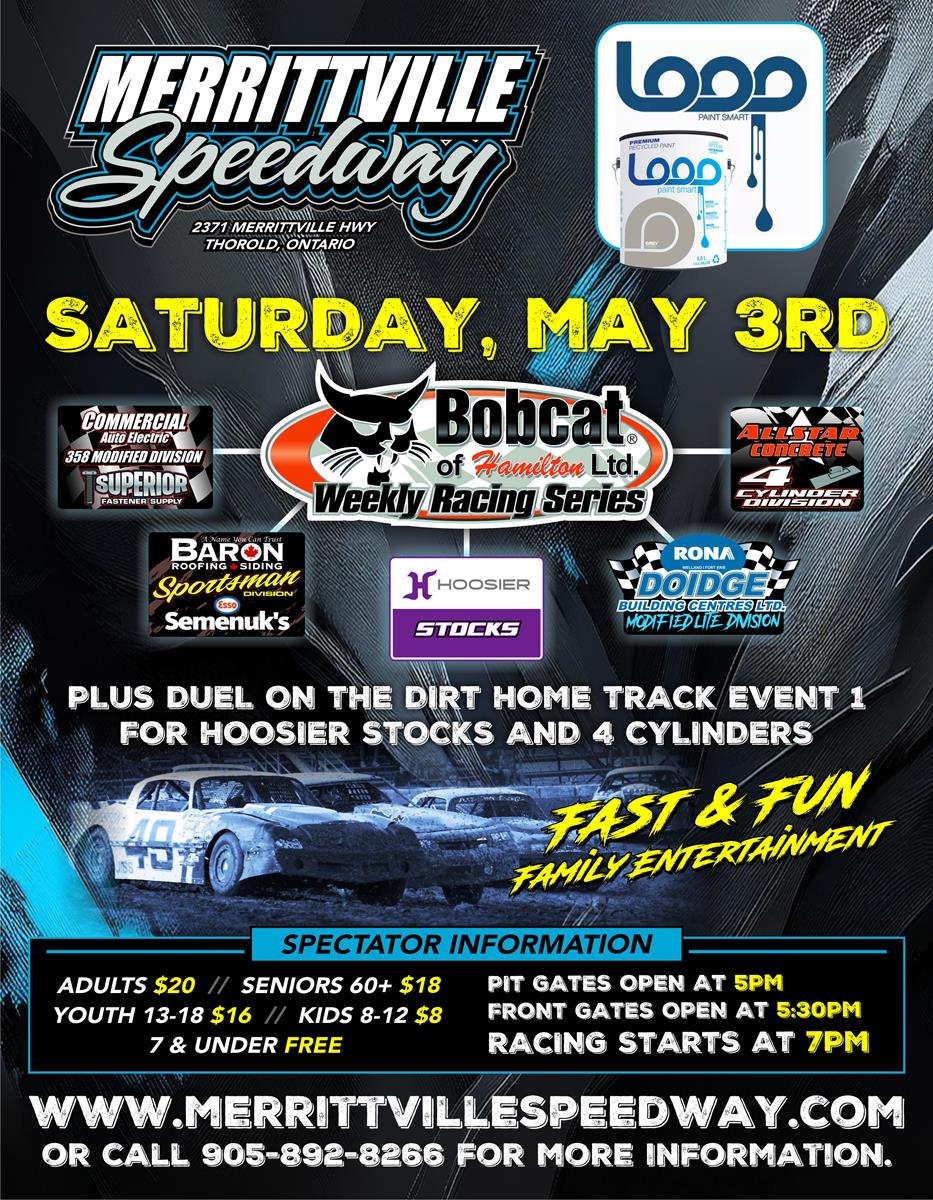 THOROLD, ONTARIO (April 28, 2025) … Loop Paint will be presenting the racing action this coming Saturday night at Merrittville Speedway. The full card of Bobcat of Hamilton Weekly Racing Series will feature the first home track event of the year for the Duel on the Dirt for both the Hoosier Stocks and the Allstar Concrete 4 Cylinders.