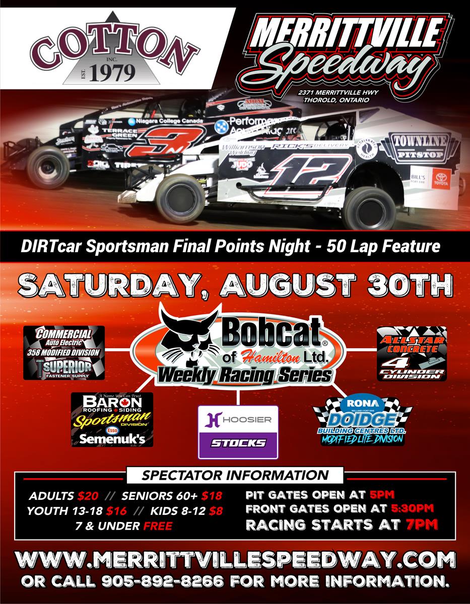 THOROLD, ONTARIO (August 25, 2025) … Merrittville Speedway will be in action on Saturday of Labour Day Weekend as Cotton Inc presents a full Bobcat of Hamilton Weekly Racing Series program, headlined by the DIRTcar Sportsman 50-lap points finale.
