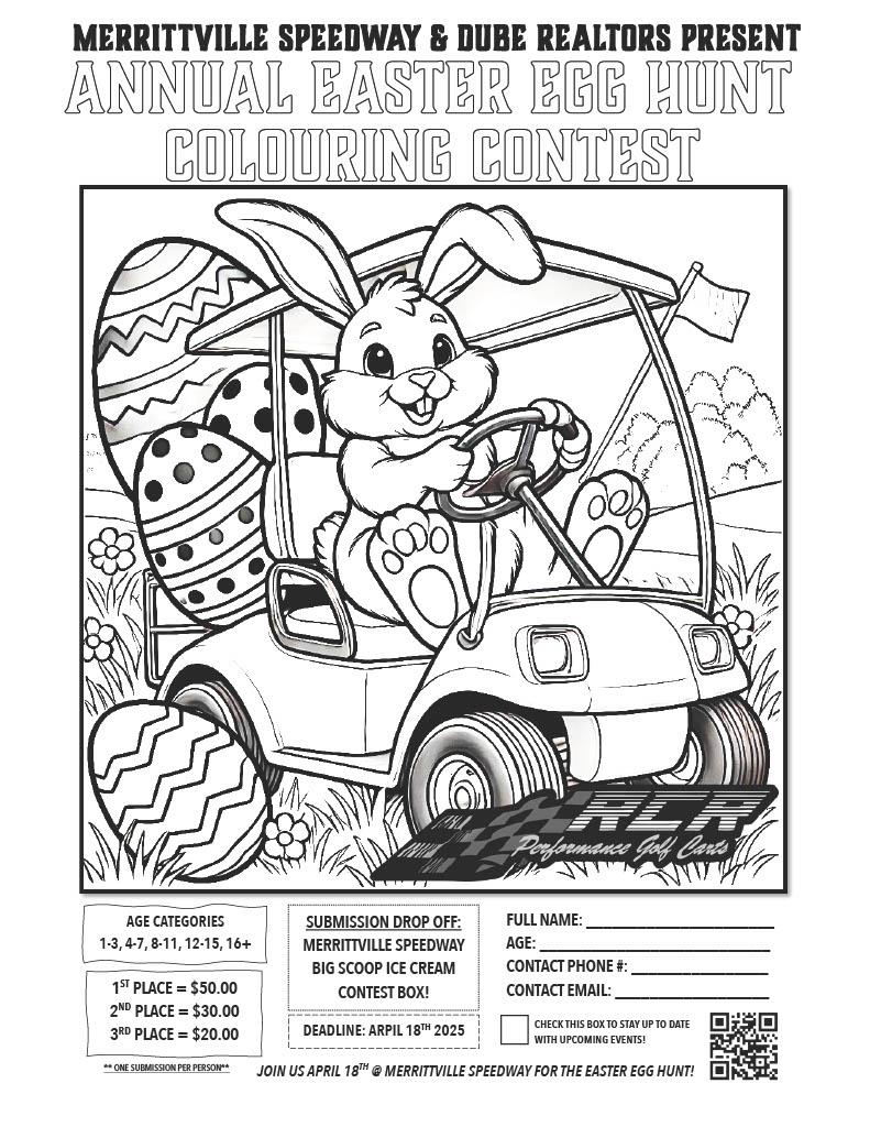 Merrittville Speedway and Dube Realtors would like to give a big thanks to this year’s title sponsor of the colouring contest, RCR Performance Golf Cart Sales. To find the colouring contest, becoming a sponsor, volunteering and other inquiries please visit www.easteregghunt.ca or contact our co-chairs.