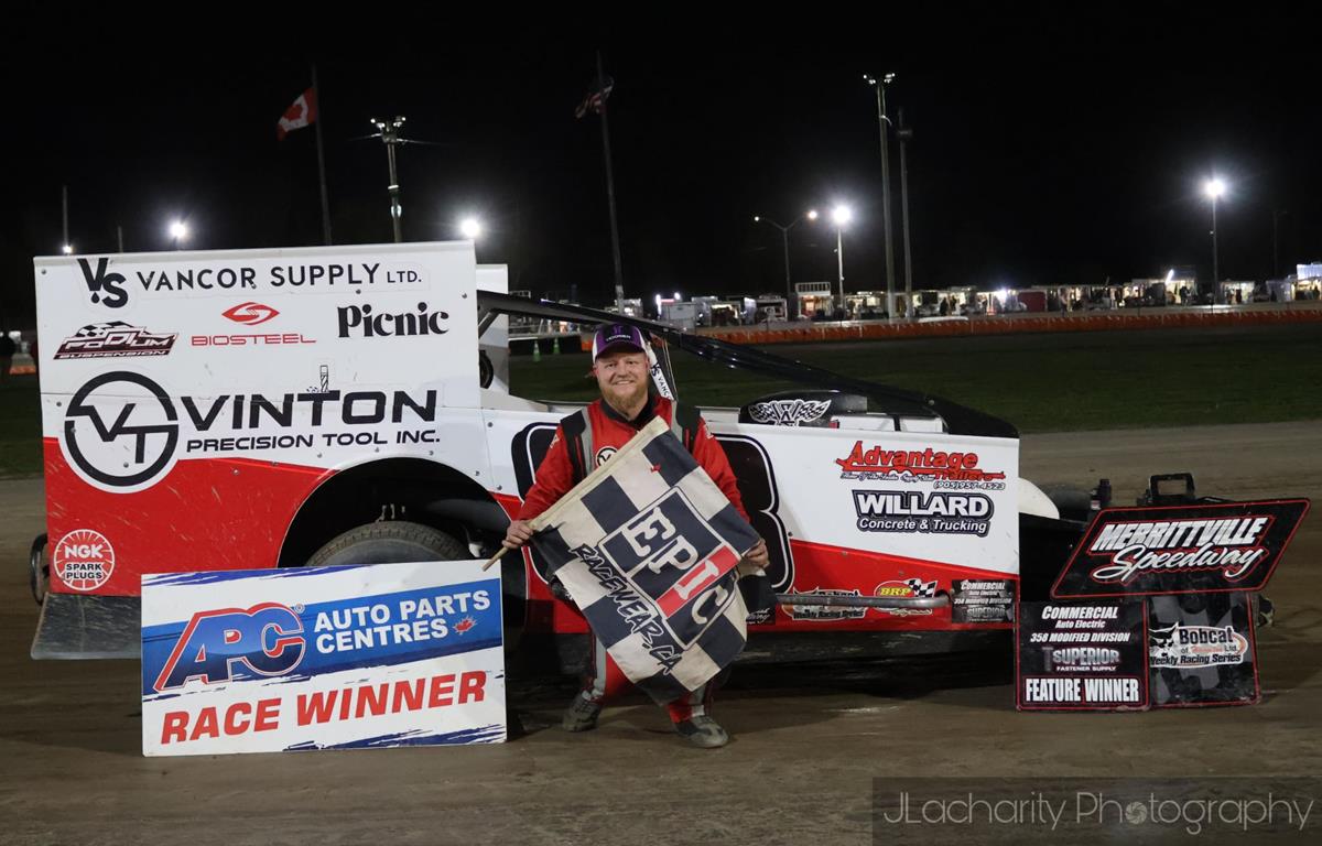 THOROLD, Ontario (May 10th, 2025) … After a week off due to rain, racing returned to Merrittville Speedway for 97.7 HTZ FM Night at the races. Shayne Pierce of St. Catharines, On. won in the Commercial Auto Electric 358 Modified feature. Fellow St. Catharines, On. native Cody McPherson won in the Semenuk’s Esso/Baron Roofing DIRTcar Sportsman event. Josh Sliter of Port Colborne, On. scored back-to-back wins in the Rona Doidge Mod Lites. The Hoosier Stocks went to Dave Bailey of Hagersville, On. and Alex Riley of St. Catharines, On. won the Allstar Concrete 4 Cylinders feature.