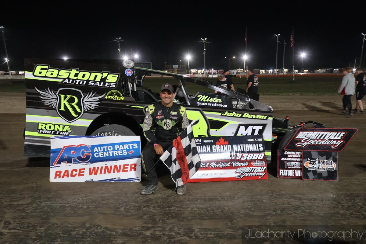 THOROLD, Ontario (August 4th, 2025) … Merrittville Speedway closed out the civic holiday long weekend with the Baron Roofing Canadian Grand Nationals that saw 122 cars enter the pits. The evening concluded with a 44 lap Commercial Auto Electric 358 Modified feature in honour of injured Niagara born driver Stewart Friesen, which was won by Ridgeway, ON’s Gary Lindberg. St. Catharines native Cody McPherson took the win in the Semenuk’s Esso/Baron Roofing DIRTcar Sportsman. Brent Begolo of Thorold, ON scored the win in the Rona Doidge Modified Lites. Dave Bailey of Hagersville, ON won in the Hoosier Stocks and Cierra Keus of Port Robinson, ON took home the checkered flag in the All Star Concrete 4 Cylinders.